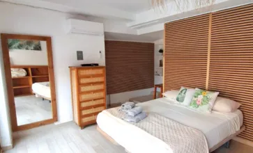 Las habitaciones Bali y Tulum ofrecen un refugio sereno de inspiración bohemia, diseñado para la relajación y la conexión. Su decoración cálida y natural crea un ambiente tranquilo, perfecto para desconectar junto al mar. La habitación Bali cuenta con una elegante bañera que aporta un extra de confort y bienestar, ideal para parejas que buscan una estancia verdaderamente especial.